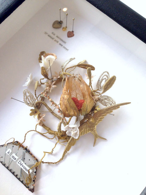 COMPOSÉS DE LIENS ET FRAGMENTS ANCIENS MES AUTELS SENSIBLES, POÉTIQUES ET UN BRIN IRONIQUES, S'ÉRIGENT EN OFFRANDE AUX BELLES OU DÉSOLANTES TRAVERSÉES DE NOS EXISTENCES .